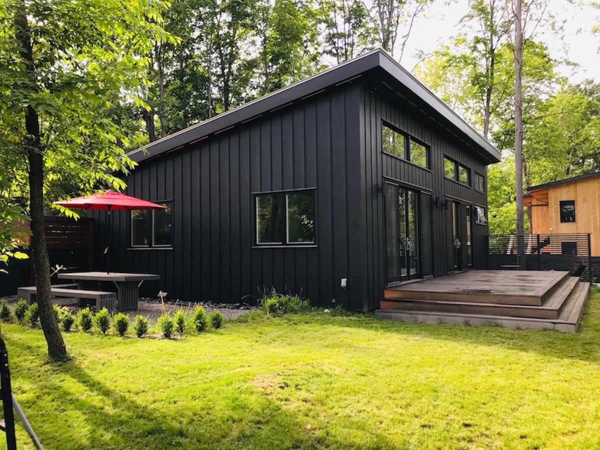 Modern Scandinavia-style riverfront bungalow on 8 acres. Sit on your deck with twinkle lights for coffee/dinner filled w sounds & views of a rushing river; walk across the river into your own private swimming spot! Perfect for a nature retreat, hiking, swimming, fishing (stocked every April), skiing, work w mountain views or write that novel you have always wanted to finish. 2 hrs from the George Washington Bridge. Level 2 EV charger. Hate has no home here-all are welcome.