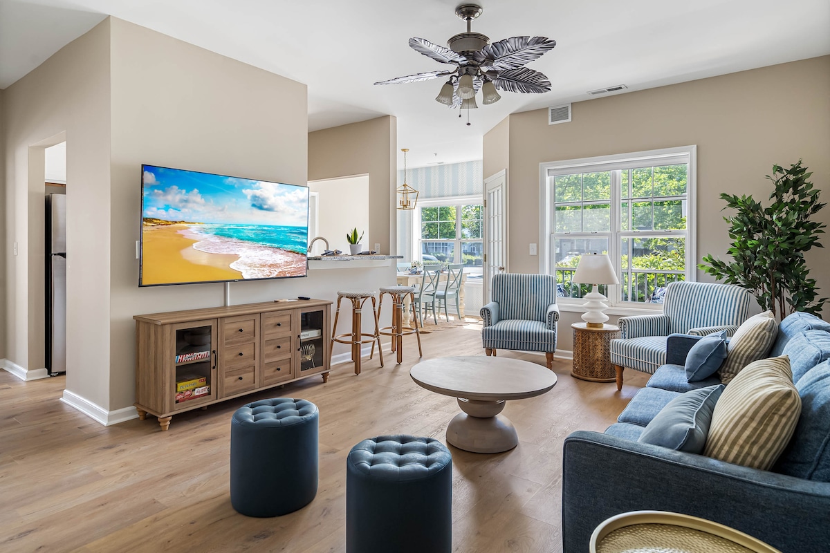 Live the beach lifestyle with every modern convenience! Roomy 2 bedroom, 2 bath condo only 10 mins from Rehoboth, Lewes and Dewey. Surrounded by craft beer, tax-free outlet shopping, and fantastic food. Cleanings exceed CDC guidelines. Three 65" 4k TVs with 221+ channels, Apps, touchscreen Amazon Echos, dimmable LED lighting, and ultra high speed wi-fi. Fully renovated with luxurious flooring, quartz countertops, and new furniture. Free washer/dryer, free coffee, free parking, and water views.