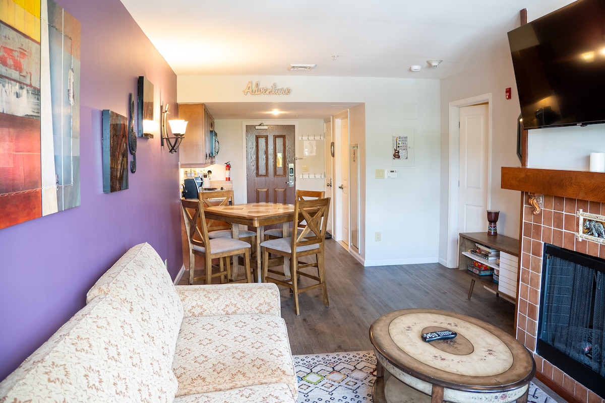 Welcome to this beautifully styled 1 bedroom @ The Appalachian @Mt Creek. Highlights include: -Sleeps 4 total -Separate Bedroom, King Bed, sleeps 2 with Smart TV - Full size Pull-out Sofa in Living Room, sleeps 2 - Free coffee, drip style and K-cup - Fast Wifi, new for 2025 - 55" Smart TV in the Living Room - Gas push button fireplace - Private balcony with Valley Views - Fully equipped Kitchenette, pots, pans, utensils, etc - Fresh linens include - 3 Pools, Sauna open year round