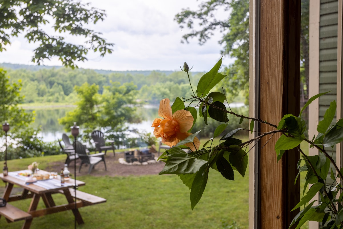 Quiet Private lakehouse set down on 2 rare rock bluffs giving you a majestic water view just like it was in 1939. Extra Lg Great room w a huge fireplace. The great kitchen surrounds the chef. Big hot tub, Rowboat with canopy, 8 kayaks, Treehouse, Neverending Lakeside windows, docks, 1 hr from Manhattan w Eagles & vast wildlife like you were in the deep woods. Clean, unspoiled lake full of fish. Never had gas motors. A Mountaintop lake above the ski area. Stargazing! Perfect for get-togethers.