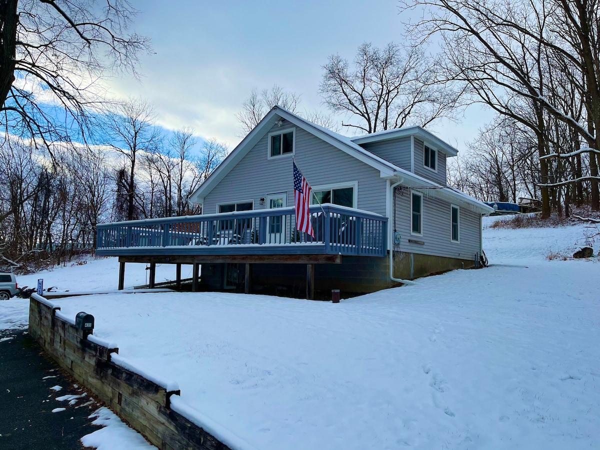 Quiet Private lakehouse set down on 2 rare rock bluffs giving you a majestic water view just like it was in 1939. Extra Lg Great room w a huge fireplace. The great kitchen surrounds the chef. Big hot tub, Rowboat with canopy, 8 kayaks, Treehouse, Neverending Lakeside windows, docks, 1 hr from Manhattan w Eagles & vast wildlife like you were in the deep woods. Clean, unspoiled lake full of fish. Never had gas motors. A Mountaintop lake above the ski area. Stargazing! Perfect for get-togethers.