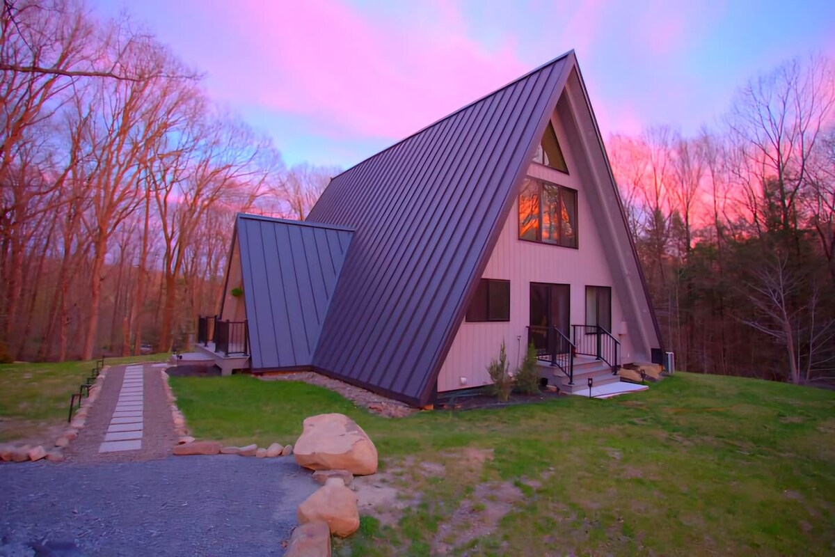 Unwind and Recharge at our serene, one of a kind A-frame nestled on 4 private acres. Enjoy a sunken hot tub, chef’s kitchen, 135" theater, arcade, fire pit and a tranquil creek running through, providing a soothing soundtrack to your stay. Our newly built wood burning Sauna facing the creek will take you to entirely enchanted world. Located at a unique tristate meeting point surrounded by charming towns, local farms, vineyards, near by activities like hiking, skiing, sky diving and water sports.
