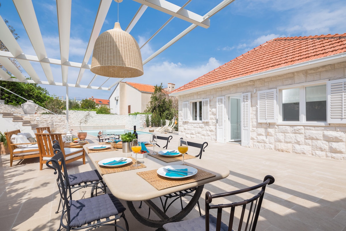 Traditional stone villa, on the hill, in the center of Sutivan, overlooking Brac Channel, Split and mainland. Features 2 terraces: - Sun protected Dinning Terrace for alfresco dining, - Upper Sunny Terrace with stunning view, ideal for evening relaxation 22m2 pool. 3 bedrooms. 2 bathrooms (1 en-suite). Wi-Fi. Air Conditioned. Close to everything. 3-5 min walk to beach, shops and other amenities. 2 parking spots. Private and quiet. PROMOTIONAL PRICES FOR 2024. LIMITED TIME OFFER!