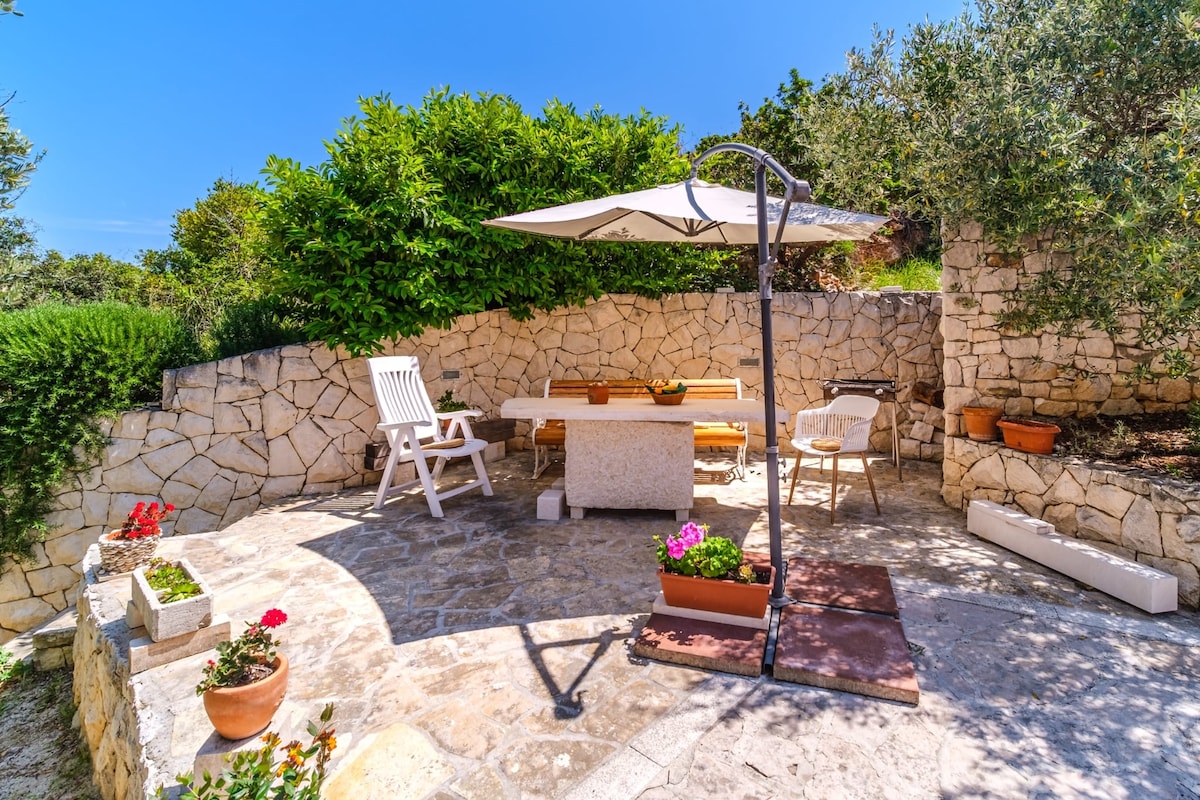 Stone Beauty from 1467, cultural monument located in the historical core of Pučišća - one of the 15 most beautiful small towns in Europe. The restorted medievel castle will give you moments of peace and quiet because the front of the castle is facing the sea and the town and behind there is a garden, a courtyard and three terraces for moments of rest. The first floor apartment consists of a dining and living room, kitchen, bathroom and bedroom with a view of a garden.