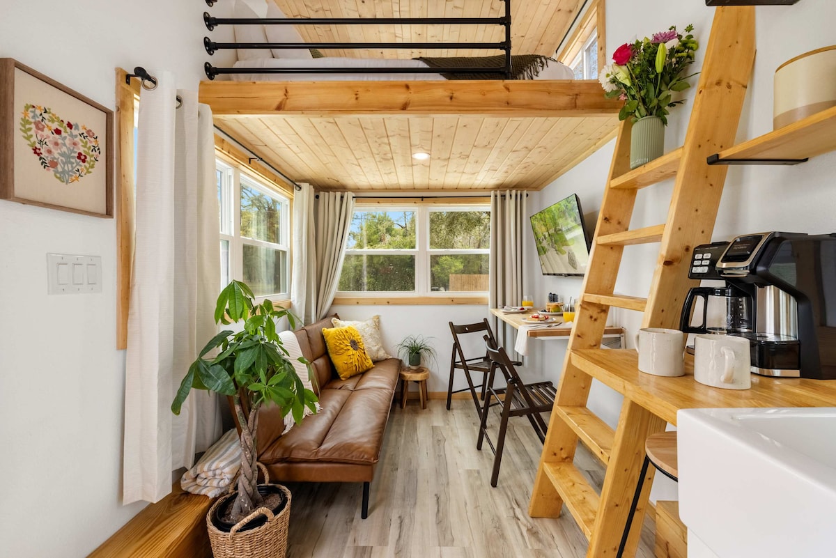 ↞------------------- Newly Built | Ganesh Tiny Home -------------------↠ ✓ Designer Quality Tiny Home ✓ 2 Miles From Ichetucknee Springs ✓ Fully Equipped Kitchen ✓ Outdoor Picnic Table and Grill ✓ Fire Pit ✓ HD LED Smart TV ✓ Complimentary Tea & Coffee Bar ✓ High speed Starlink Wifi internet ✓ Serene Getaway *Please note that sleeping spaces are accessed by stairs. This tiny home is NOT wheelchair friendly or suitable for those with a disability that would prevent them from climbing stairs.