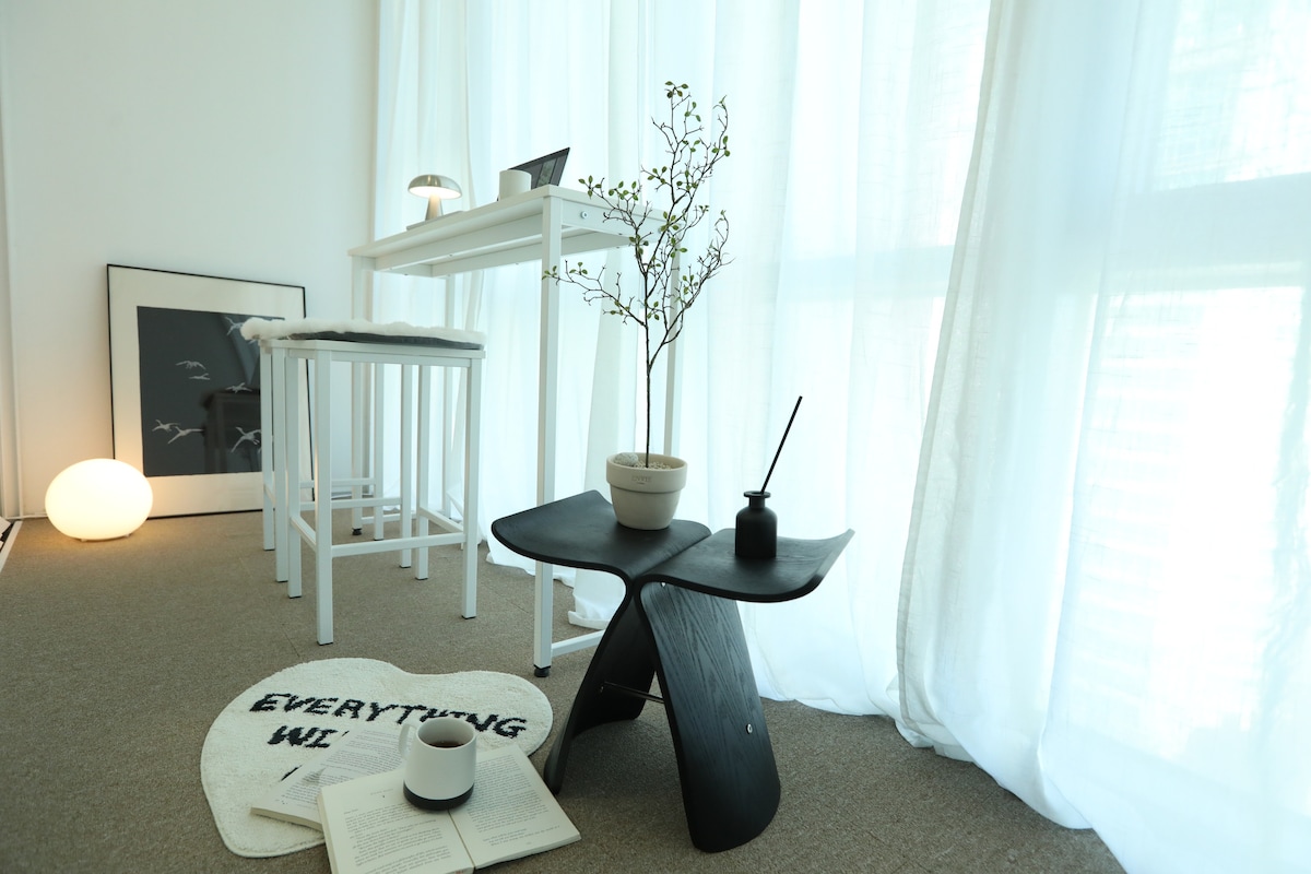 안녕하세요, 반갑습니다 😉 Noemma는 일과 생활 사이의 균형을 위해 설계된 공간입니다. 갑작스레 잡힌 업무 일정의 비즈니스 고객과 여행자의 장기 체류에도 불편함 없는 구조와 비품, 차분한 분위기를 제공합니다. 원룸 형태로 퀸사이즈의 침대가 있는 침실, 간단한 요리가 가능한 주방, 바테이블이 있는 무드 있는 테라스와 욕실의 구조인 공간입니다. 장기 투숙에 최적화된 조용한 생활 공간. 일하는 사람, 휴식을 추구하는 여행자를 위한 실용적이고 아늑한 숙박을 지향합니다. 바쁜 일상 속에서도 생각은 정리되고, 생활은 안정되는 곳. Noemma는 머무는 동안의 ‘리듬’을 존중합니다. 동탄신도시의 풍경이 보이는 테라스에서 낮에는 햇살 가득 받으며 차 한잔과 업무 또는 음악 감상을, 밤에는 무드 있는 등과 야경을 벗삼아 와인 한잔을, 그런 무드가 어울리는 곳, 'Noemma'입니다. 동탄의 중심 상권에 위치하면서도 조용하여 사생활을 즐길 수 있는 Noemma에서 편안한 시간 되세요