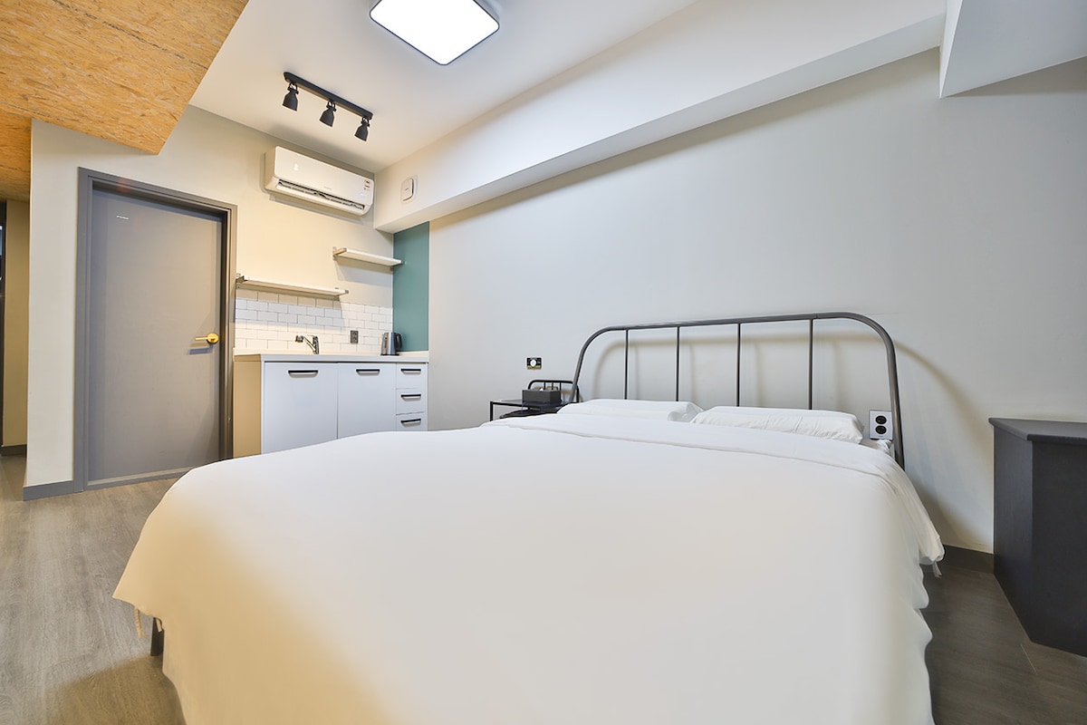 해당숙소는 수원역 인근에 자리한 도보로 방문 가능한 신축급 68객실 규모의 원룸형 레지던스 입니다. 원룸의 취사(하이라이트+씽크대)와 세탁기 냉장고(냉동냉장기능)가 있어 풀옵션 원룸같은 시설에 숙박업소의 룸 클리닝 서비스가 결합된 레지던스 숙소입니다. 객실 내 취사가 가능(조리도구 필요 시 사전 요청)합니다. 룸 내 개별 와이파이, 하이라이트, 씽크대 , 에어컨, 냉장고, 세탁기, 커피포트 책상, 의자2, 침대, TV 등이 모두 구비되어 있습니다. 꼼꼼한 객실 관리로 청결한 룸 컨디션을 제공 합니다! 게스트는 사용하는 동안 개인 룸 사용을 하게 됩니다. ^^ 만약, 예약을 원하시는 룸이 자리가 없다면 메시지 문의 주시기 바랍니다! 감사합니다.