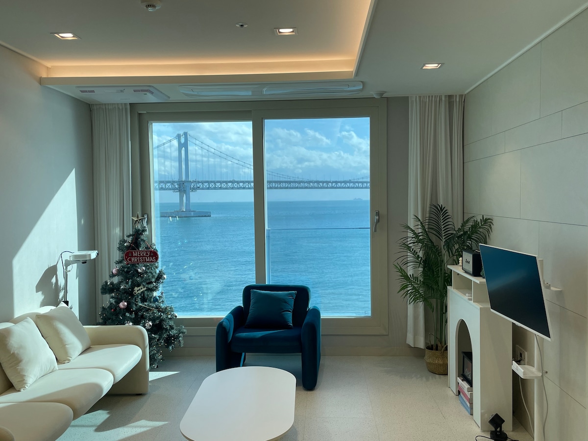 ❤️최근 방 확장 공사를 하여 침실 2개, 거실 1개의 구조로 퀸 침대 1개, 더블 침대 2개로 여유있게 주무실수 있어요:) 안리빌라(Anri villa)를 찾아주셔서 감사합니다. 🎇초근접 광안대교를 볼 수 있는 환상적인 브릿지 뷰(full ocean view) 💕거실과 침실 모두에서 볼 수 있는 힐링 풀오션뷰와 광안대교뷰 "인생샷을 남겨보세요"💖 신축 20평형대 프리미엄급 숙소로👍 매일 침구류 세탁과 살균소독 및 청소, 청결을 최우선으로 합니다.😉🎇 🍃숙소 건물내 지하1~3층 무료 주차장(자주식) 🍃스마트TV로 넷플릭스 유튜브 등을 즐겨보세요. 🍃바로 옆 밀락더마켓, 해운대 차로 10분 거리 🍃1층 카페, 와인샵 등 편의시설이 있어요. 🍃🍃 안티스트레스 티(유기농)와 핸드드립 커피, 인센스가 준비되어 있습니다. 마음이 복잡했다면 따뜻한 차와 향과 함께 조금은 해소되길 바라요.