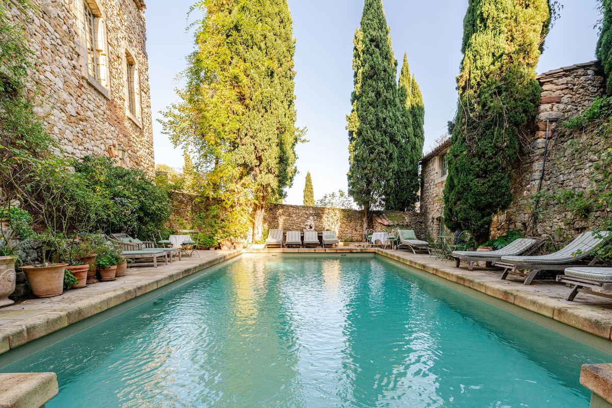 The cottage sits on the grounds of a castle dating back to 1543 offering an authentic stay. The interior retains a decor that matches the historic charm of the area with modern comforts added and a shared pool in the stunning gardens outside. This is our smallest cottage and cannot take an additional bed or cot. The other cottages are all larger and can do this. All 3 cottages can be rented separately or together. They are in the grounds of a 16th century castle with beautiful gardens and large swimming pool enclosed by stone walls. The lower salon and summer kitchen in the main chateau is available to share. Access is by the side garden gate and all cottages are accessed by stone steps- sadly not suitable for wheelchairs. We will most likely be present living in the main Chateau and available to help and advise about restaurants and things to do in the area. We will share the pool and gardens. The old village is in a beautiful part of France that is has retained its iconic beauty through the centuries and still feels untouched by modern life in many places. Experience true local dining and bakeries with scenic walking trails all around. parking is in the church square below the Chateau. There is a local taxi service in the village and bus service to Avignon, Banyols sur Ceze and Uzes but car hire is recommended. We are 20 minutes from Avignon TGV rail station and about an hour from Marseille, Nimes or Montpellier airports. The cottages are completely private and tranquil.