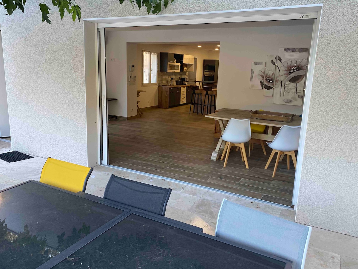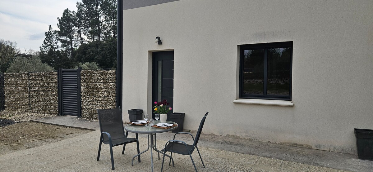 Meublé de tourisme classé 4 * : 65m2 dans écrin de verdure. La terrasse privative donne sur une forêt de chênes et de pins avec vue sur les collines. Une chambre avec un grand lit (qualité hotellerie) et une salle de bain attenante + une cuisine ouverte toute équipée et donnant sur un salon avec 2 banquettes-lits simples. Équipement complet, piscine partagée avec les propriétaires Nous serons ravis d’échanger sur les bonnes adresses de la région si les voyageurs le souhaitent.