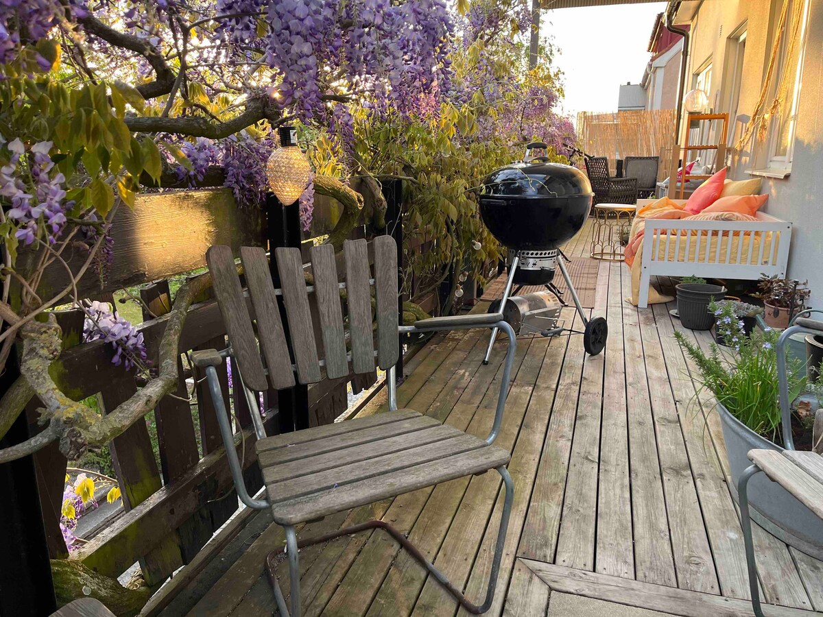 There are very few actual summerhouses in Gudhjem. Here is one - unique - both in style and location. The nordic/bohemian vibe is thoroughly implemented throughout the house. Everything from the bedroom with the pitoresque view upstairs to the kitchen/ livingroom area with the fireplace and the french door leading to the romantic small courtyard devided into tiny patios in different levels, to the lounge area with gasgrill amongst clematis on the surrounding stone fence, just screams hygge !