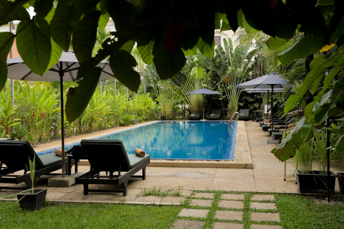 A spacious boutique home of 5 bedrooms with a private pool, built in a unique style of Khmer and Western architecture with an oasis ambiance, located near the largest local market of Siem Reap, only 10 minutes from downtown Pub Street, and 15 minutes to the marvelous Angkor Wat. This beautiful villa is ideal for a group or a family to enjoy a private stay and feel as if you are at home. Authentic Khmer meals, transport/guided tours, and airport transfers could be arranged during the stay.