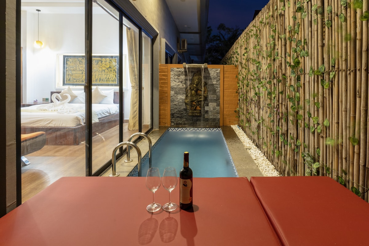 Escape to our Khmer-style Private Pool Villa in a tranquil village near Siem Reap river. Surrounded by lush greenery, it combines traditional Khmer charm with modern comforts like a rooftop private pool, Wi-Fi, and air conditioning. Relax in the garden, enjoy authentic cultural decor, and explore nearby temples and markets. Perfect for a peaceful, culturally rich getaway.