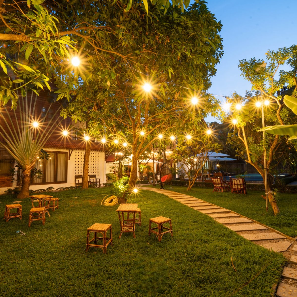 The Natural Khmer Style Villa with 12 units surrounding by a beautiful garden. There is a swimming pool, an outdoor and indoor dinning area. Our kitchen serve breakfast, lunch and dinner. we can also arrange a home cooking class for you. We are located in a quiet area 2.5 km from town center, pub street, night market, and just behind the circus, next to the horse riding farm and quad bike ridding. We have tuk tuk available anytime.