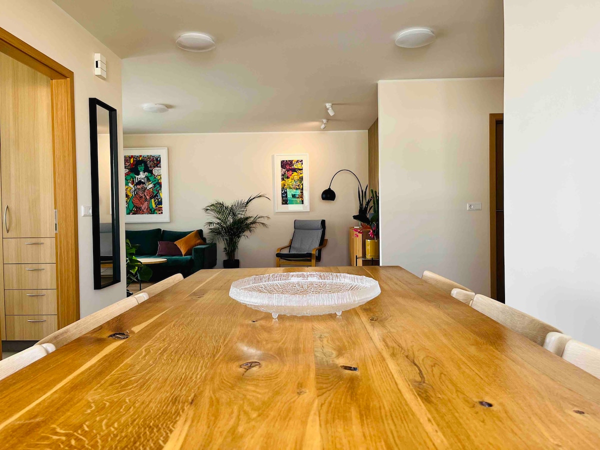 The apartment includes: 1 bedrooms with queen size double beds(beds for 2 persons) 1 bedroom with twin beds(beds for 2 peraons) 1 sofa bed with a mattress in the living room Total of 5 persons fit this apartment. 1 bathroom with a walk in shower. Fully equipped kitchen and dining table for 5 persons. The apartment is not shared with anyone else. .