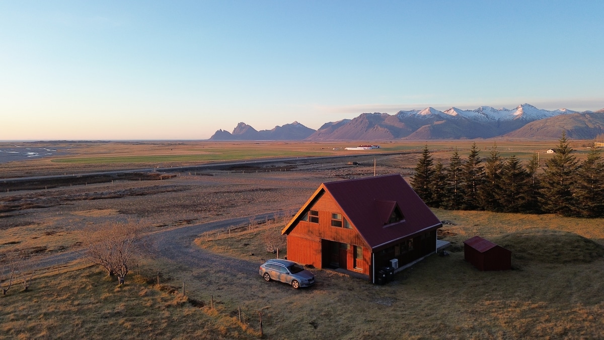 Our summer house is located in a magnificent area, in the Vatnajökull National Park, just 100 m from the Ring Road. Views of the surrounding mountains can be enjoyed from the summerhouse. Jökulsárlón Glacier Lagoon, one of the biggest tourist attractions in Iceland, is only 40 km away. Another attraction include Heinabergsjökull, an exquisitely beautiful lagoon which is less touristy than Jökulsárlón. Vestrahorn mountain, close by Höfn, have a beauty which is breathtaking.