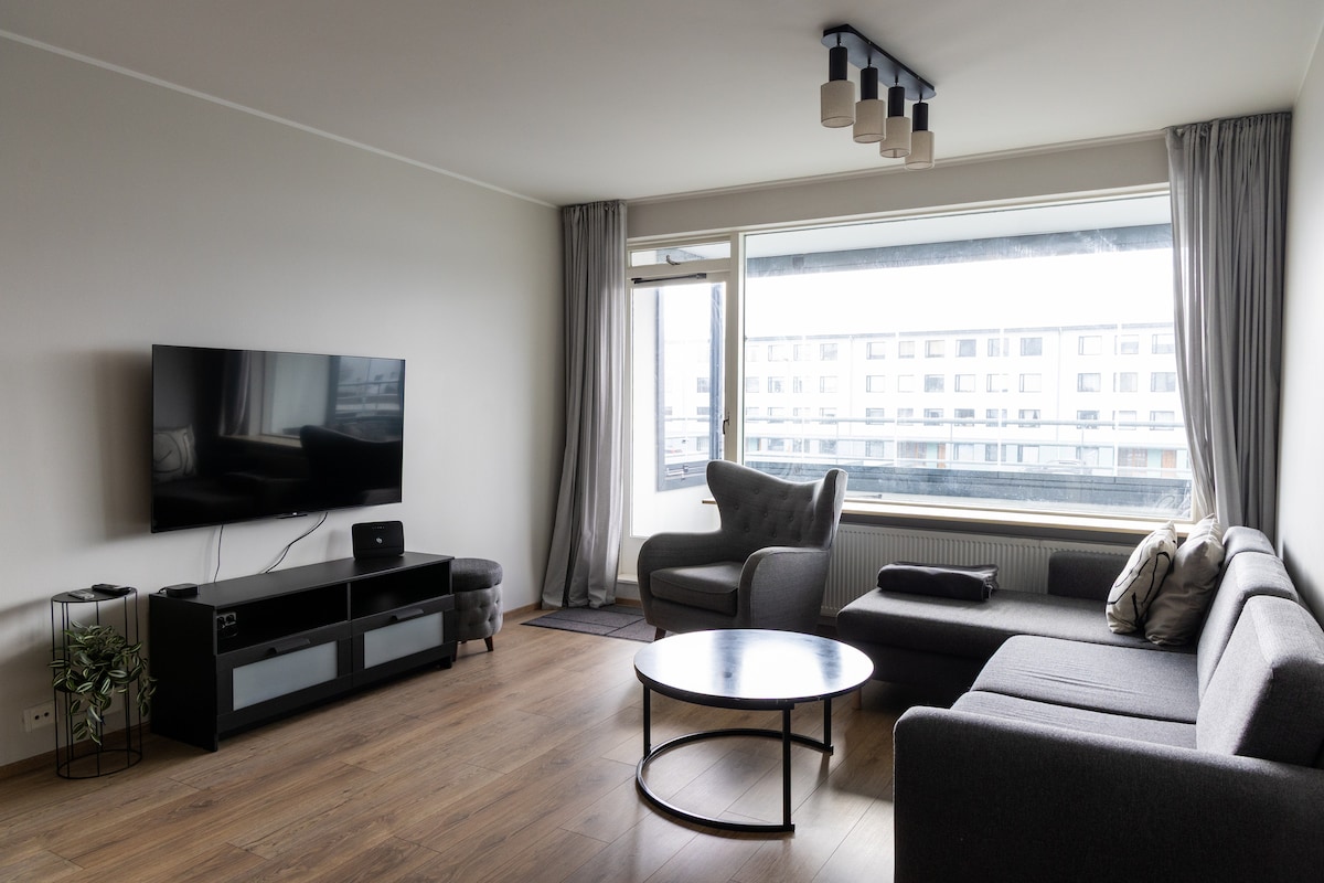 This apt has a stunning view over Reykjavik and the harbour. It sleeps 4 people comfortably, has a NEW comfy sofa bed in the living room so 4 people, adults or kids can sleep. A lift will take you to the 7th floor to reach the apt. It is nicely furnished in a modern way. Very quiet and well accessible.