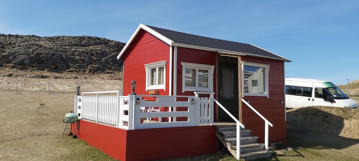 Charming, private wood cabin located in a small village on the Northwest coast of Iceland. Secluded enough for intimate privacy, still close enough to the center of the village and community. Untouched Icelandic nature is the backdrop to the cabin, with mountain views, ocean views, beautiful hiking routes surrounding the area, black sand beaches and little light pollution for fantastic views of the Northern Lights. It is truly a perfect spot for an authentic summered in nature Icelandic experien