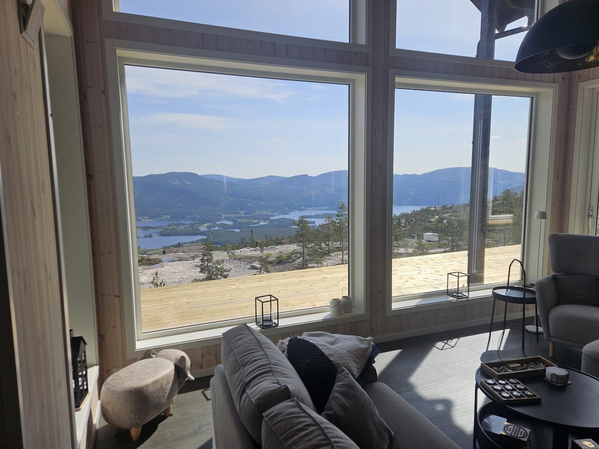 Moderne hytte på 150 kvm leies ut - ligger helt for seg selv - ingen naboer! Hytta er bygd i 2022 og har en romslig stue-/kjøkkenløsning med store vinduer. Dette gir en unik følelse av nærhet til naturen og fantastisk utsikt til både skog, fjell og vann. Stor terrasse på 100 kvm rundt nesten hele hytta gir gode solforhold hele døgnet