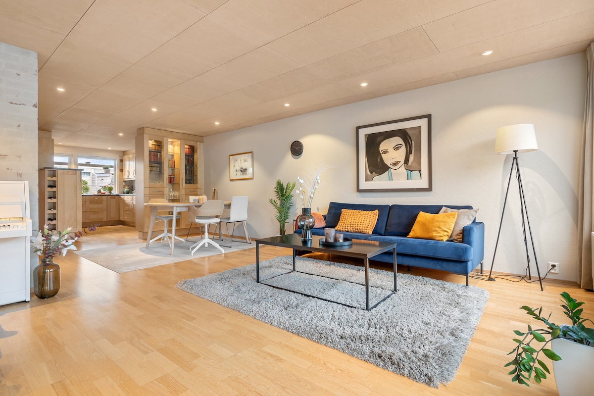 Opplev en lys og moderne leilighet med høy standard, stilrent interiør og en romslig atmosfære. Leiligheten har to innbydende soverom, et delikat bad og en stor stue møblert med kvalitetsmøbler. Du disponerer også en privat terrasse på 40 kvm. Med garasjeplass, heis og beliggenhet på attraktive Solsiden bor du med kort vei til restauranter, butikker, sentrum og fjorden. Et komfortabelt og stilfullt opphold i hjertet av Trondheim.