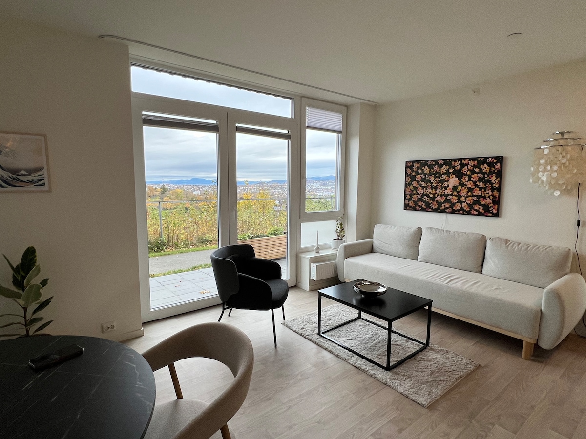 Moderne leiligheten med vakker utsikt mot Trondheim. 10-15 min med buss/bil til sentrum- Parkering i parkeringskjeller inkludert. Lekeplass utenfor leiligheten. Det er også en skole i næreheten, perfekt for barn til å leke. Skiløpe (Bymarka), golfbane og friidrettsbane i nærheten. Rolig område. To soverom : -seng på 140*200 -seng på 160*200 en sovesofa i stuen(140*200) mulighet for barnseng 50 m2, passer for Max 4 voksne. For familie med barn er det 6 sengeplasser.