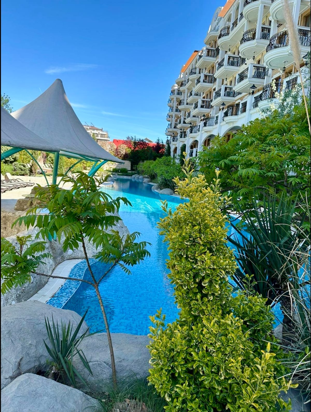 Leilighet til leie i Royal Beach Resort, et 5-stjerners luksusresort åpnet i juni 07, sentralt i Sunny Beach, 50 meter fra Svartehavet. Tilgang til Royal Garden med VIP-svømmebassenger, butikker, 4 restauranter, spa, sikkerhet, parkering. Utforsk Nesebar, UNESCO-byen, og nyt Bulgarias vin. Opplev luksus og kultur i Sunny Beach.