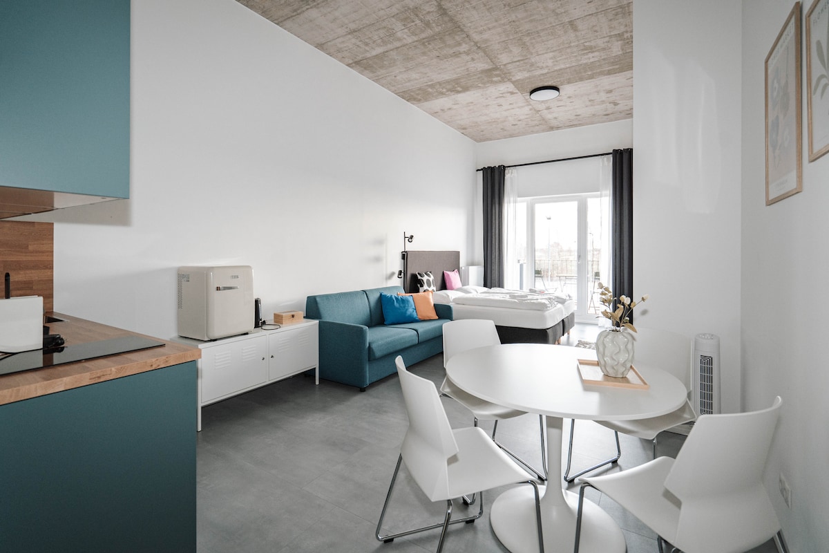 Erleben Sie Augsburg von oben! Genießen Sie den Panoramablick vom 20. Stock unseres stilvollen Apartments im Hotelturm. Voll ausgestattet mit schnellem Internet, Smart-TV (Netflix, Prime, WOW), Küchenzeile, und bequemem Arbeitsplatz. Kostenlose Parkmöglichkeiten auf der Straße. Nur wenige Gehminuten zum Hauptbahnhof und der Tram, die Sie direkt ins Stadtzentrum bringt. Ideal für Geschäfts- und Städtereisen.