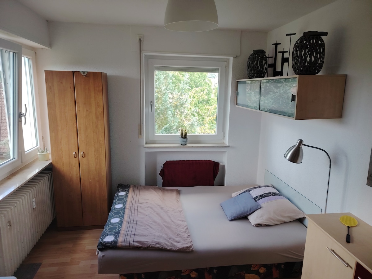 Wir vermieten unser großzügiges Nichtraucher-Gästezimmer im neu ausgebauten Dach unseres Hauses, mit Vorraum, Dusche/WC, Kabel-TV, Teeküche (Wasserkocher), Kaffeemaschine, Mikrowelle und kleinem Kühlschrank. Wir stellen Essgeschirr zur Verfügung, aber es besteht nicht die Möglichkeit zu kochen. Geeignet für bis zu vier Erwachsene, Babybett auf Wunsch möglich. Einkaufsmöglichkeiten, Schwimmbad Titania und öffentliche Verkehrsmittel in der Nähe.