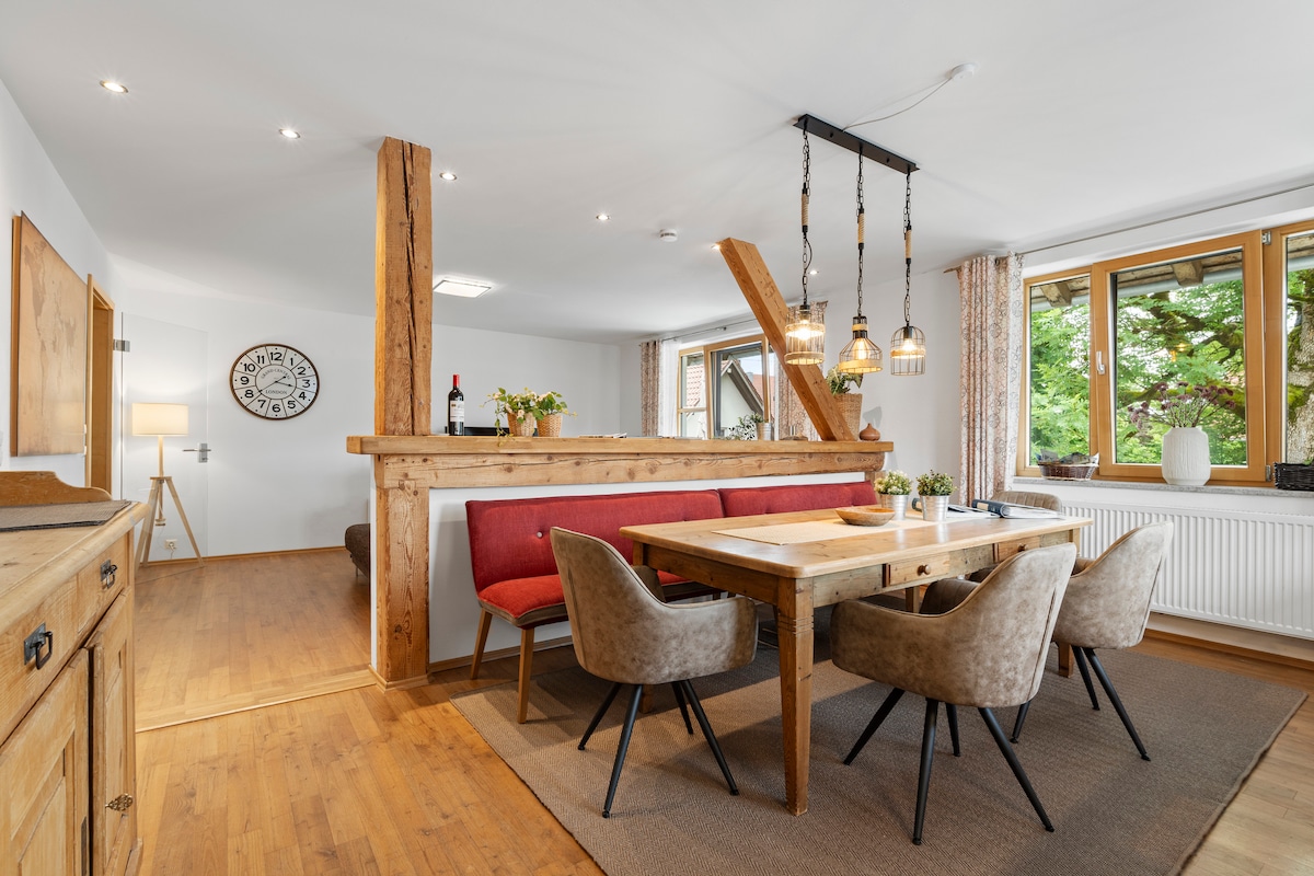 Our bright, charming apartment in Pfronten accommodates up to 5 guests and offers a spectacular view over the rooftops of Pfronten and the Allgäu mountains. Ideally located for exploring Neuschwanstein Castle as well as numerous ski and hiking areas. Start your day with breakfast on the balcony while enjoying the panoramic mountain views – the perfect retreat for nature lovers and anyone seeking relaxation.