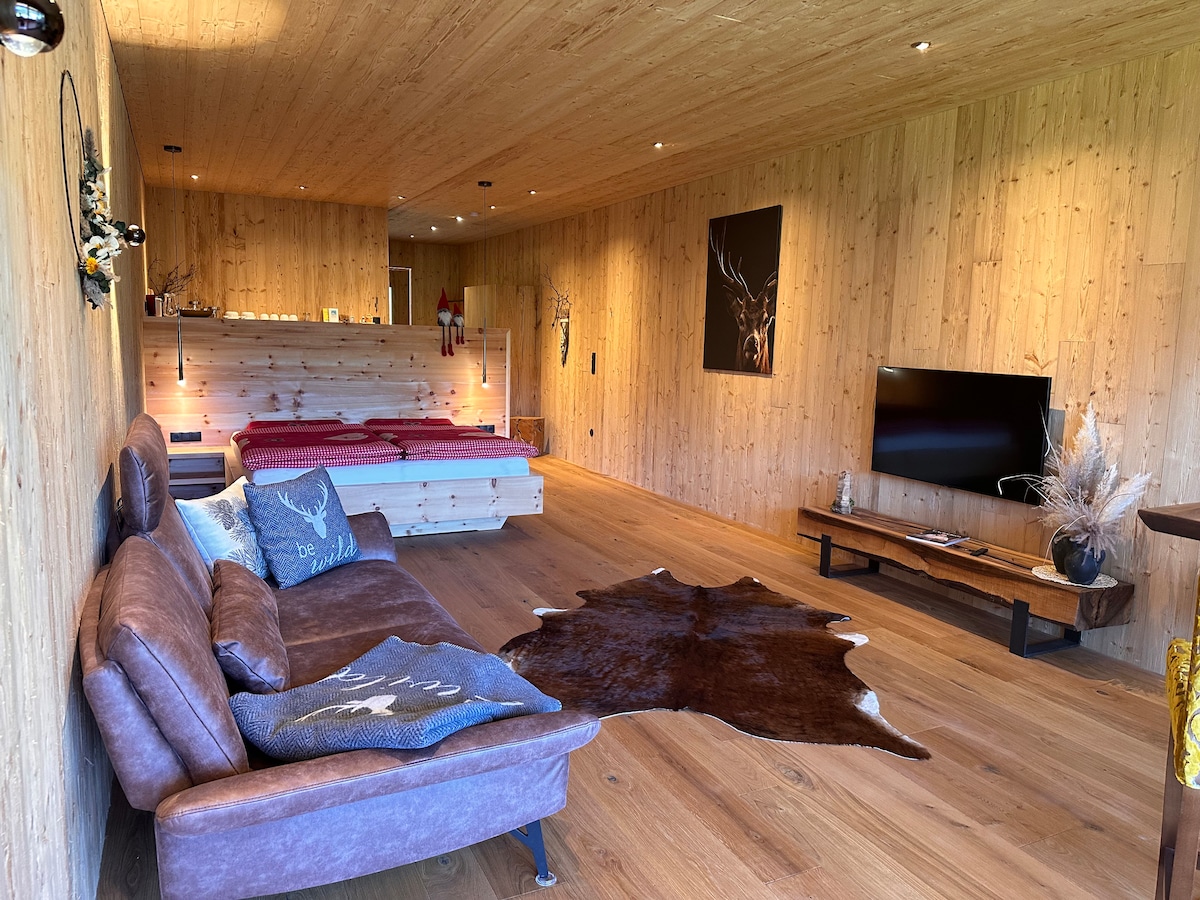 Servus im Alpenu, unserem kleinen Hideaway auf 1.044 Metern Seehöhe in den Allgäuer Alpen. Wir haben mit viel Liebe aus dem ehemaligen Stall ein kleines Refugium geschaffen. Unseren Gästen steht eine geräumige Wohnung (ca. 58m²) mit Garderobe, einem Bad aus Naturstein, einer voll ausgestatteten Holzküche, einem Vollholzzirbenbett, einem Wohn-Essbereich mit Fernseher und eine großzügige Terrasse mit Süd und Westseitigem Blick incl. Gartenzugang zur Verfügung.