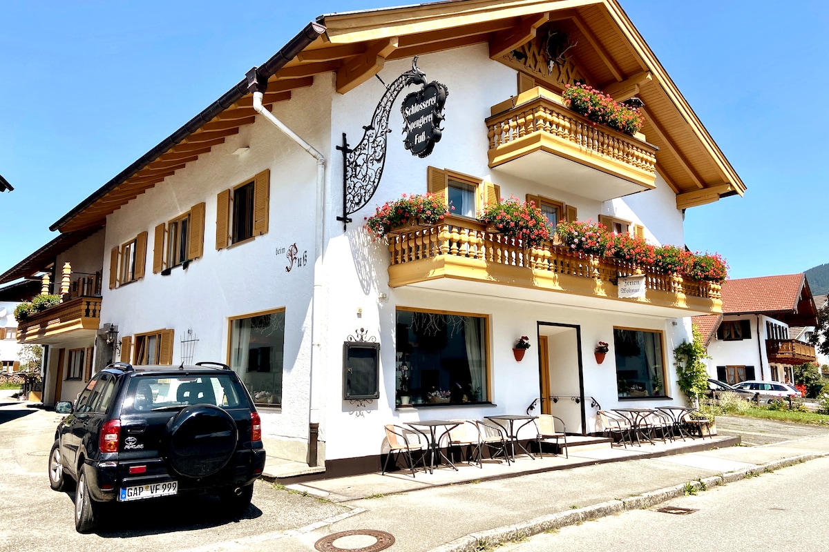 Welcome to our spacious Veronika holiday apartment (90 m²) in the heart of Unterammergau. Your stay includes the Königscard, which offers 200 free top experiences such as summer mountain railways, boat trips, climbing gardens, e-bike hire, toboggan runs, museums, handicrafts and much more. Parking spaces (free of charge) are available at the house.