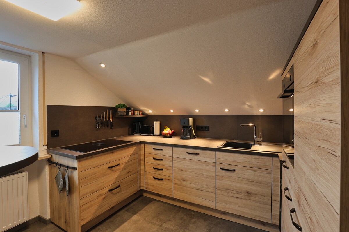 Die Wohnung ist ruhig gelegen, verfügt über einen eigenen Eingang und ist für 2 Personen, evtl. mit Kind, geeignet. Sie ist 70 m² groß, verfügt über ein großes Schlafzimmer mit einem 140x200 + 90x200 Bett. Der Wohnraum mit Küche ist mit Fernseher, Stereoanlage, einem Kaminofen und einem Esstisch ausgestattet. Der Kochbereich ist mit Herd, Backofen, Mikrowelle, Kühl/Gefrierschrank und reichlich Kochutensilien ausgestattet. Das Badezimmer verfügt über eine geräumige Dusche, WC und Waschmaschine