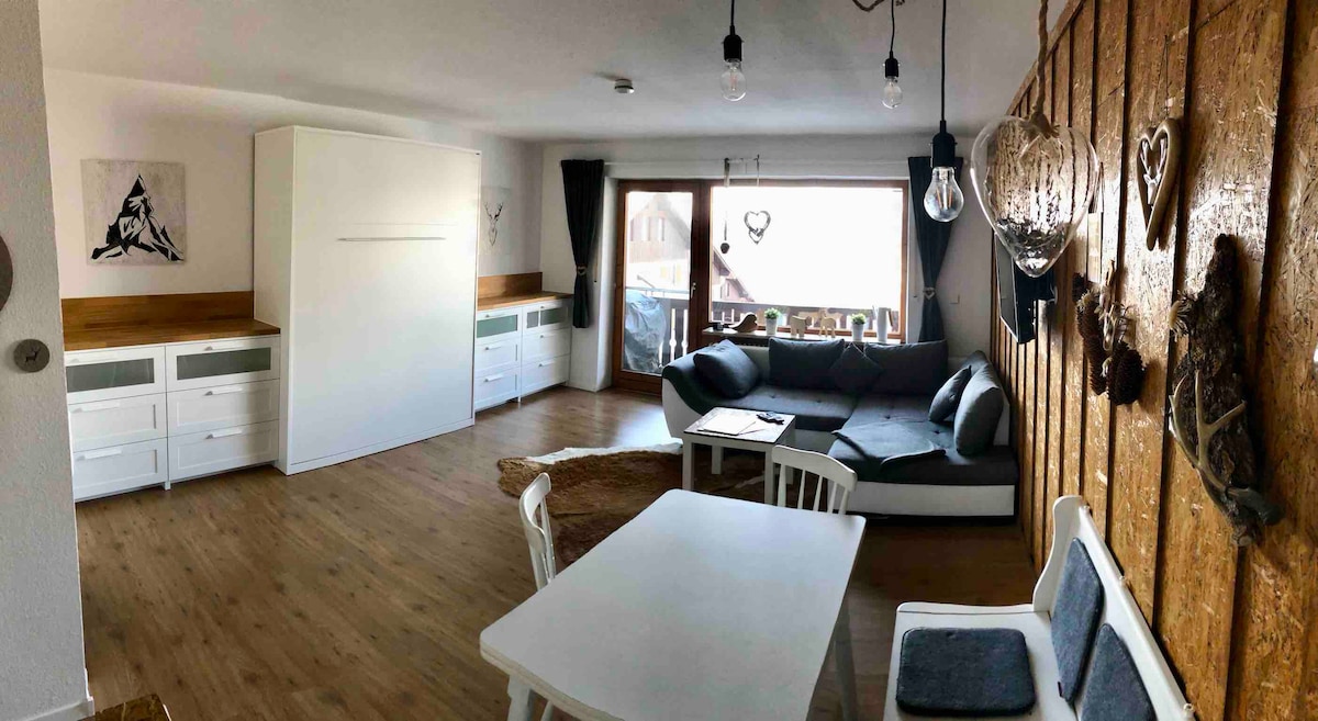 NOTE: Pool currently closed for renovation (Sauna remains open). Panorama Escape at Lake Rottachsee Prime 42 sqm apartment (2–4 guests) in Petersthal: - Lake View: Direct views of the lake & Mt. Grünten. - Group Tip: Located on the same floor as our "Village View" apt. - Sustainability: CO2-neutral heating via local district network. - Wellness: Pool & Sauna (coin-op) in the building. - Location: Near Neuschwanstein & Allgäu Alps. - Extras: WiFi, table tennis & laundry room.