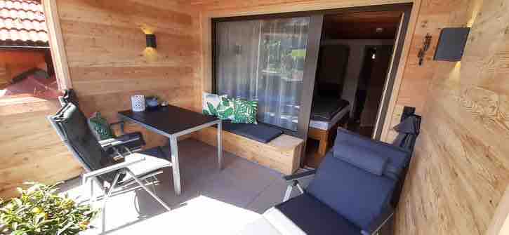 ein kleines kuscheliges, romantisches Chalet für 2 mit Elektro-Kamin und Himmelbett, alles in einem Raum, mit 33m2. Offene Küche, kleines Bad überdachte Veranda mit Gartenanteil. Zur Info und heut zu Tage sehr wichtig: W-lan funktioniert nicht immer aber immer öfter... bucht Eure Wellnessbehandlung gleich mit, derzeit gibt es 15% auf jede Behandlung: zb: eine ganz wunderbare Gesichtsbehandlung mit Edelsteinmassage oder eine Ganzkörpermassage u.v.m. Aline freut sich auf Deinen Termin