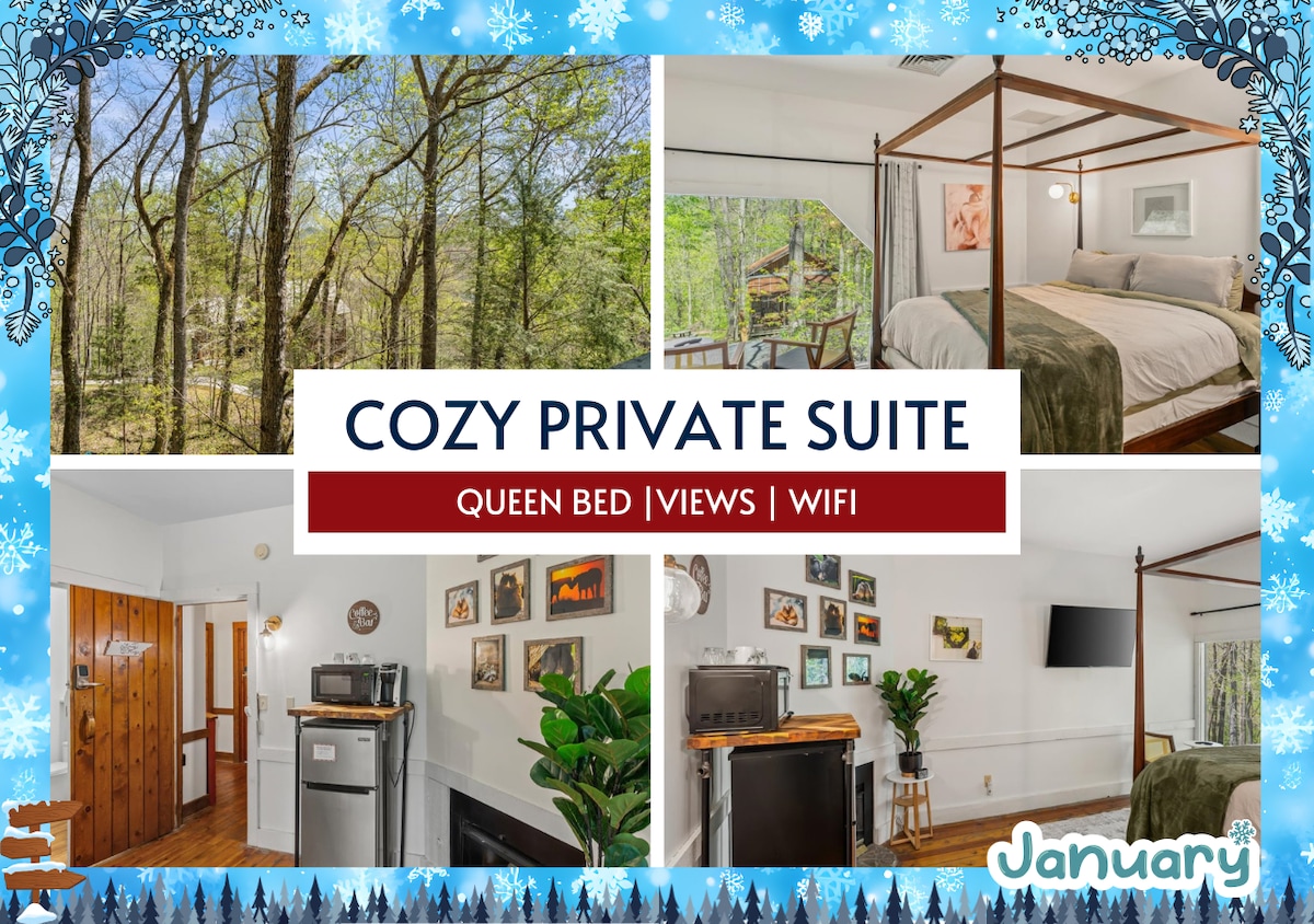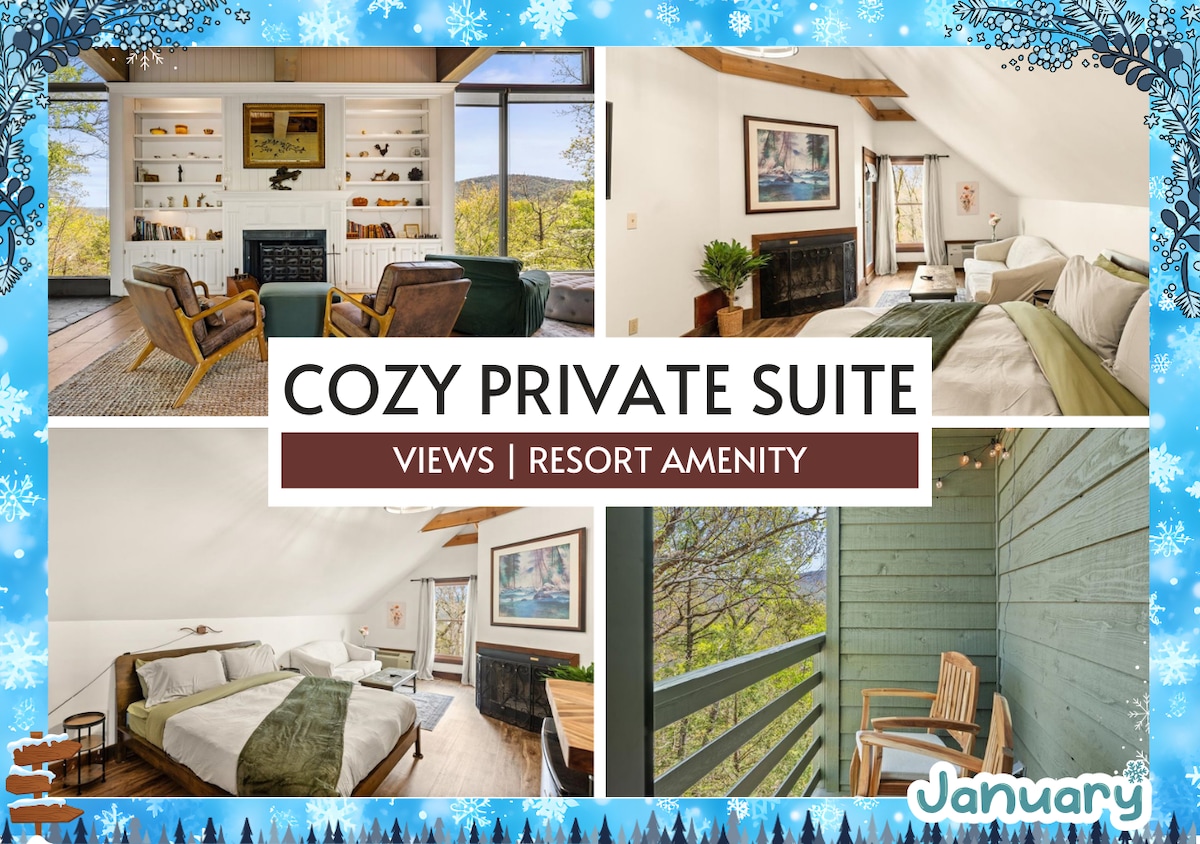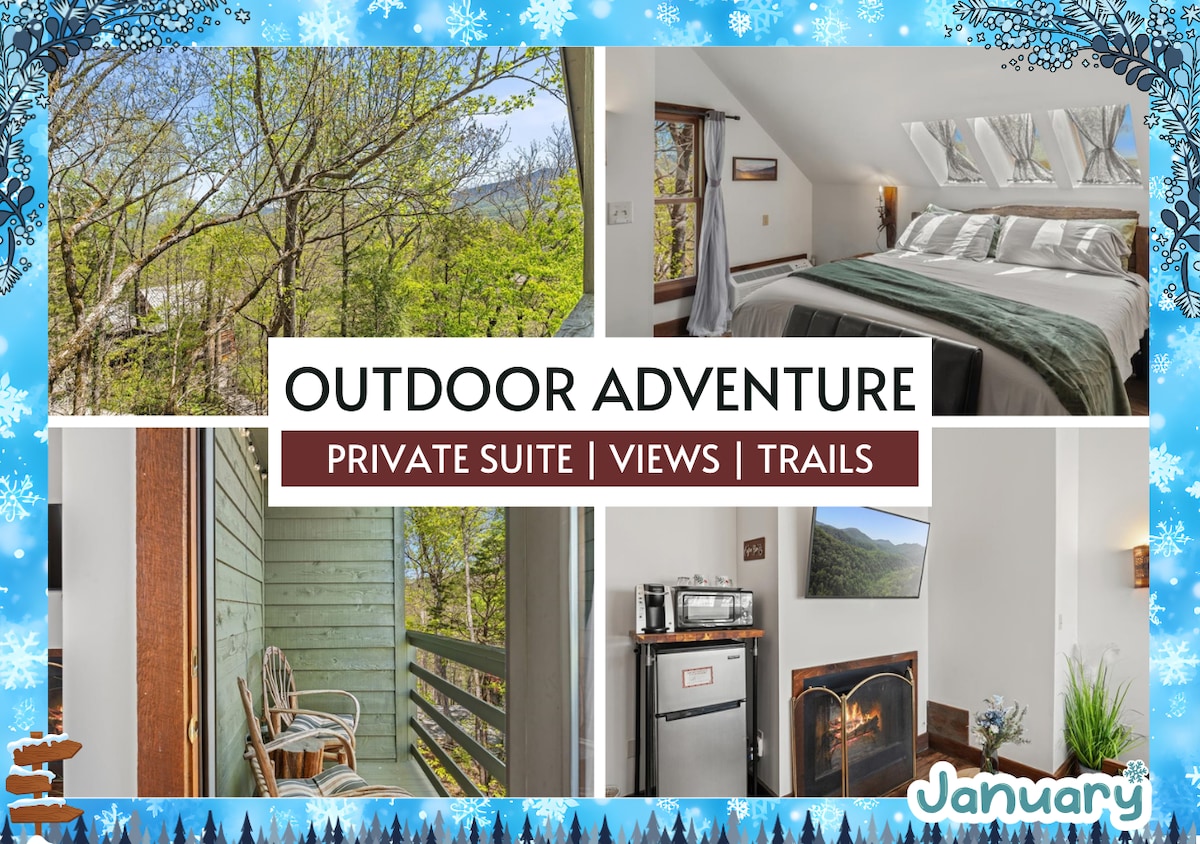 ★ “Twilight Ridge was the most peaceful place I’ve stayed. We watched the stars through the skylights and had coffee on the balcony—it was perfect.” ★ Twilight Ridge is your personal pocket of peace in the Smoky Mountains. This spacious suite blends mountain charm with modern comfort—skylights above the bed, a cozy sofa nook, and a private balcony with forest views—plus complimentary breakfast each morning.