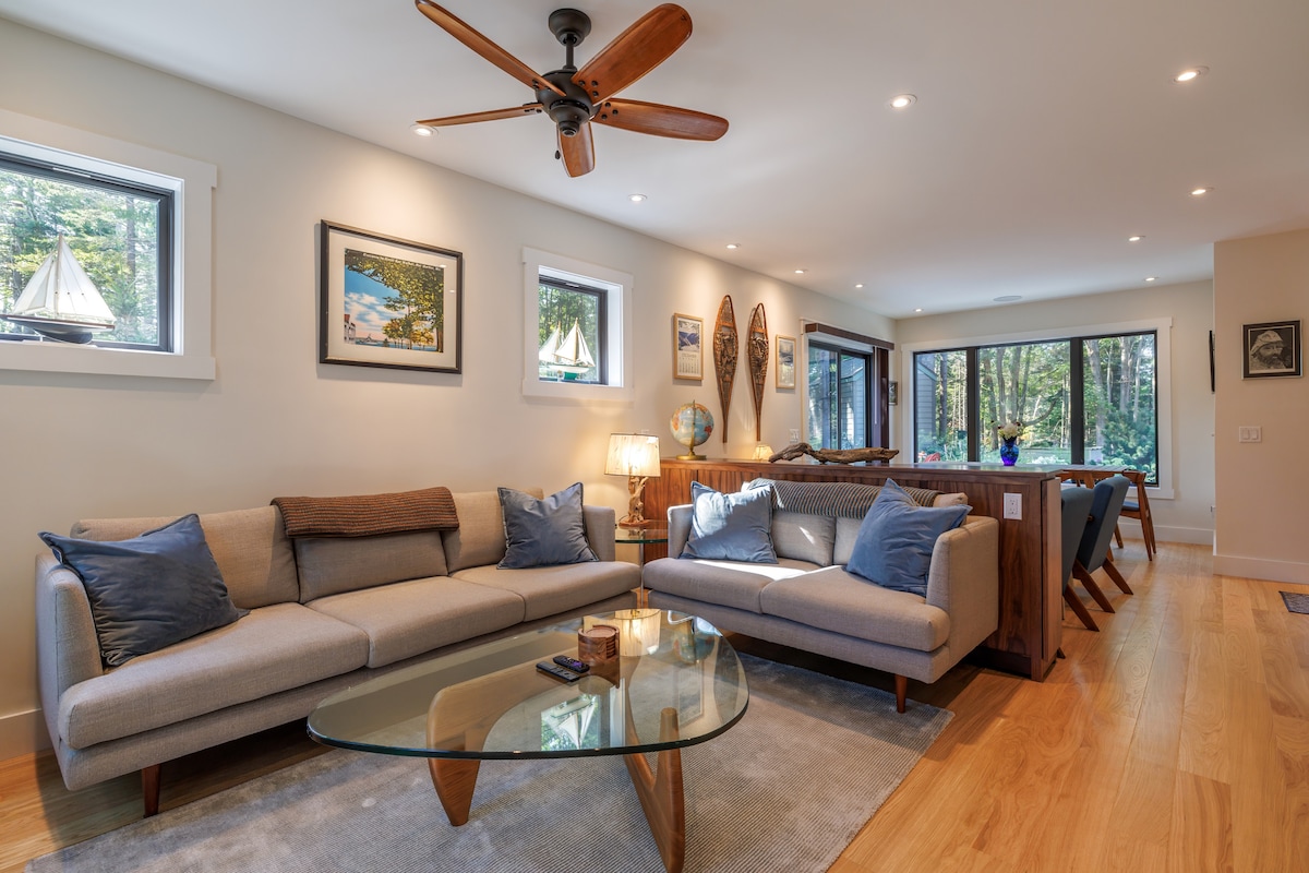 Romantic and luxurious, this 2,000 square foot modern cottage nestled on twelve acres is a favorite of honeymooners and lovers of modern design * 1 hour to Acadia National Park & Bar Harbor; 15 min to shopping, hiking, swimming * Stargazing deck * 2 full baths, one with steam shower * Fully equipped kitchen with under-counter fridge/freezer * Two gas fireplaces, one indoors, one on a covered deck * Queen bed with luxurious linens and pillows * WIFI, streaming TV, grill, bar * EV charger