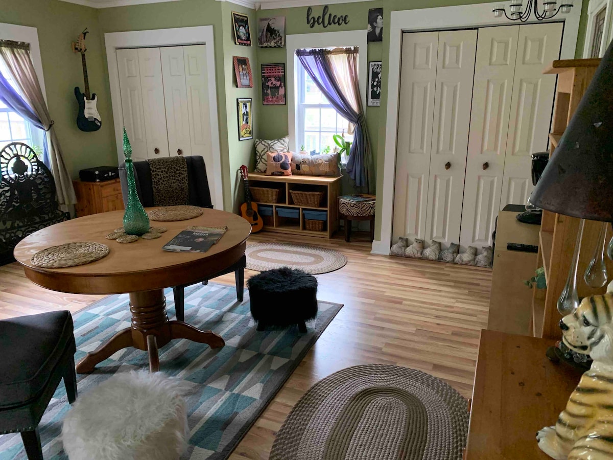 Second, 3rd floor apartment. Apartment includes a master bedroom with a full sized bed and a guest bedroom with 2 twin beds. Private bathroom. There is a dining area with refrigerator, sink,microwave,induction hot pate convection toaster oven, coffee maker, french press dining table,Alexa and LCD TV. The dining area does NOT have a STOVE. 3rd floor meditation room with skylights and sitting area with LCD. ALL APARTMENT AREA IS PRIVATE. Home backs up to woods and back garden. NO CLEANING FEES.