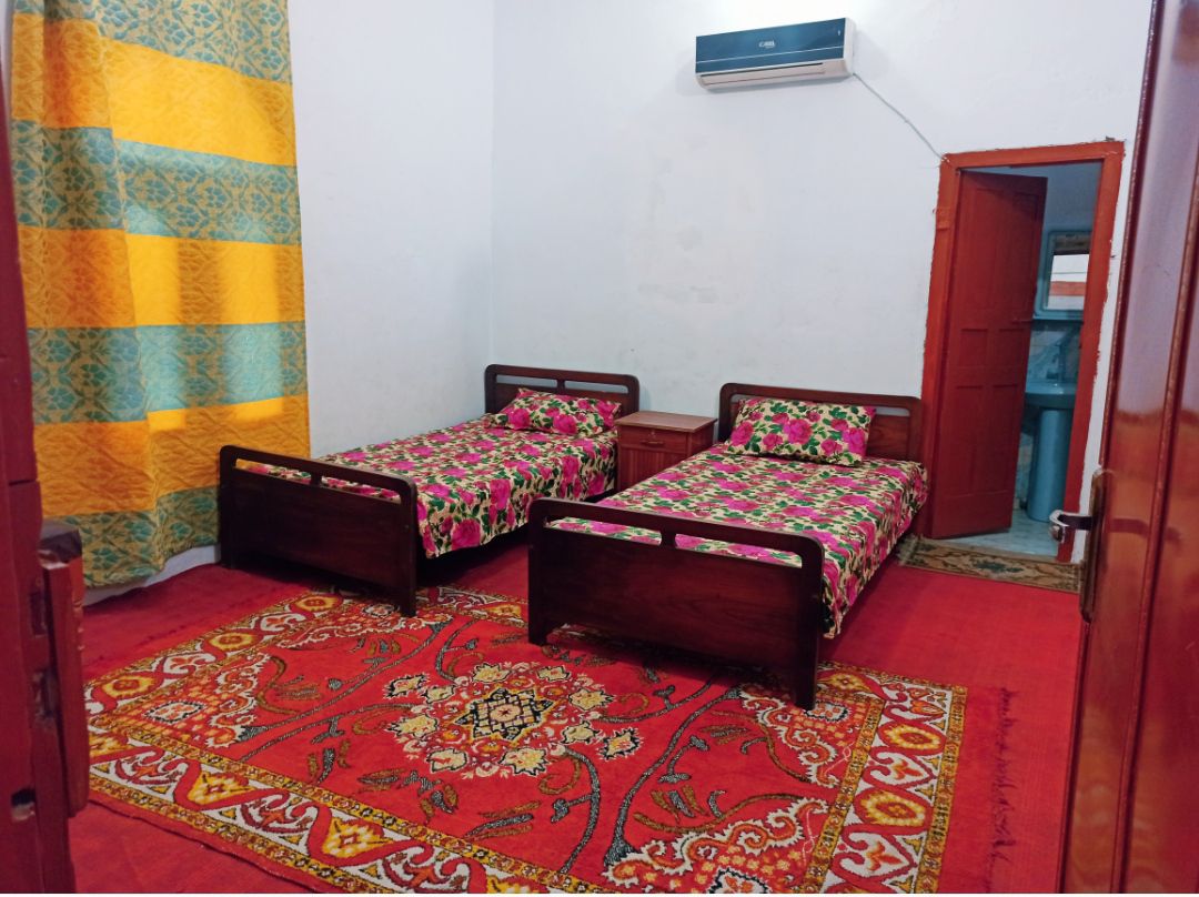 Our home portion Guests House 2 rooms Room 1, attached bath english with 2 single beds Carpeted Room 2, with antique wooden work & Arabic Majles floor seating With floor mattresses with capacity of 4 floor mates common Bath, 46” Led Tv Equipped with brand new Imported-fridge And Kenwood Microwave Oven Iron and home used kitchen utensils Gas cylinder ect. Our Listing price on room only basis ( no break Fast ) If Break Fast needed can Arrange from restaurant at cash price of 500 PKR/ head
