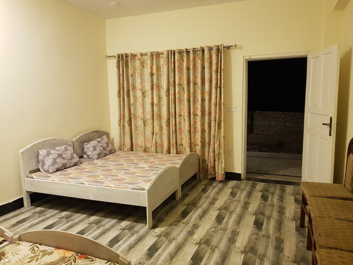 Our home portion Guests House 2 rooms Room 1, attached bath english with 2 single beds Carpeted Room 2, with antique wooden work & Arabic Majles floor seating With floor mattresses with capacity of 4 floor mates common Bath, 46” Led Tv Equipped with brand new Imported-fridge And Kenwood Microwave Oven Iron and home used kitchen utensils Gas cylinder ect. Our Listing price on room only basis ( no break Fast ) If Break Fast needed can Arrange from restaurant at cash price of 500 PKR/ head