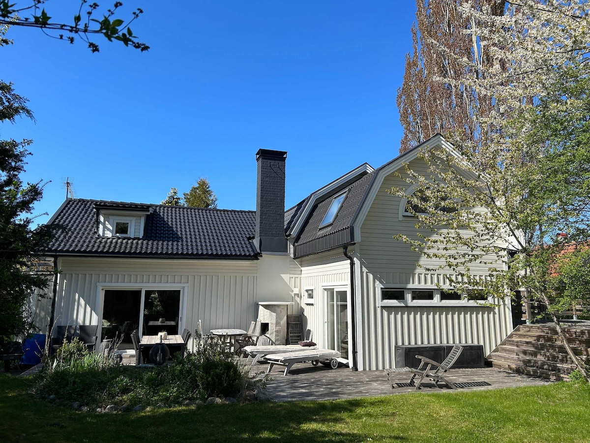 Idyllic house, large garden, right by a peaceful lake. 18 min car drive from central Stockholm. Boat + fishing equipment + lounge on lake pontoon included. speak: eng, ger& fr Master bedroom, modern kitchen, two bathrooms, dining room, living room. Washing machine, dryer, dishwasher, heated flooring, terrace, barbecue. snabbt wifi, Verisure larm. Nu kommunalt vatten och avlopp. gärna lugna tillställningar. ni bor då två eller tre nätter. Bor ni bara en natt önskar vi en extra avgift.