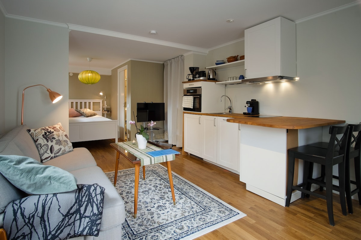 Rum med pentry, 25 kvadratmeter. Badrum med dusch. En dubbelsäng (120 cm bred) samt bäddsoffa för 2 personer. Boendet är maximerat för 2 vuxna, men finns även plats för 2 små barn. Pentry utrustad med spishäll, kylskåp, mikrovågsugn, vattenkokare, kaffebryggare. TV och Wifi. Handdukar och sängkläder ingår. Ni får även tillgång till tvättstuga som finns i huvudbyggnaden. Vi tar ut en städavgift på 200kr för sängkläder osv. Däremot räknar vi med att ni genomför en finstädning innan ni checkar ut.