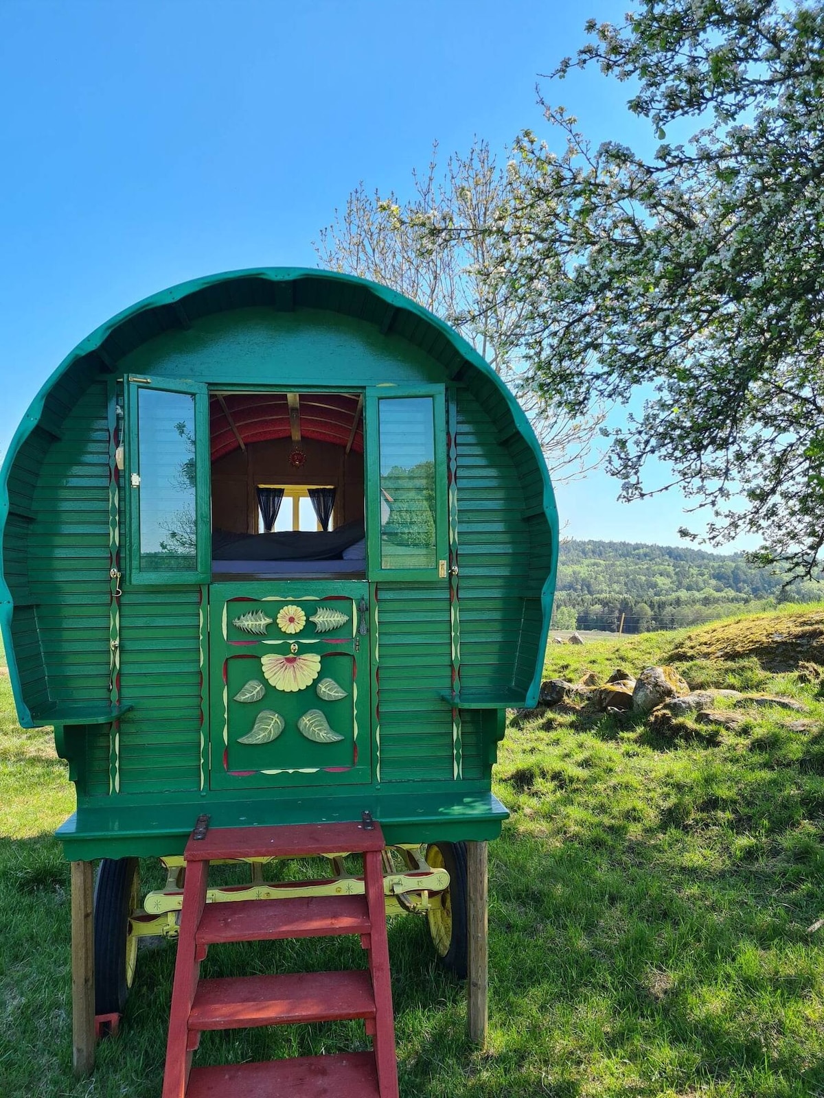 Traditional, offgrid, Scottish wagon. First built over 100 years ago and lovingly restored in the UK this little gem provides a unique and romantic getaway with a small, cozy 120cm double bed. It is situated in a peaceful meadow on a family run organic farm. It is a 5 min walk to a shared kitchen, shower, and compost WC. Outside of opening hours, you can enjoy your breakfast, dinner or reading a book in our unique Scottish café. Come meet our animals, family and see the nearby lakes and coast.