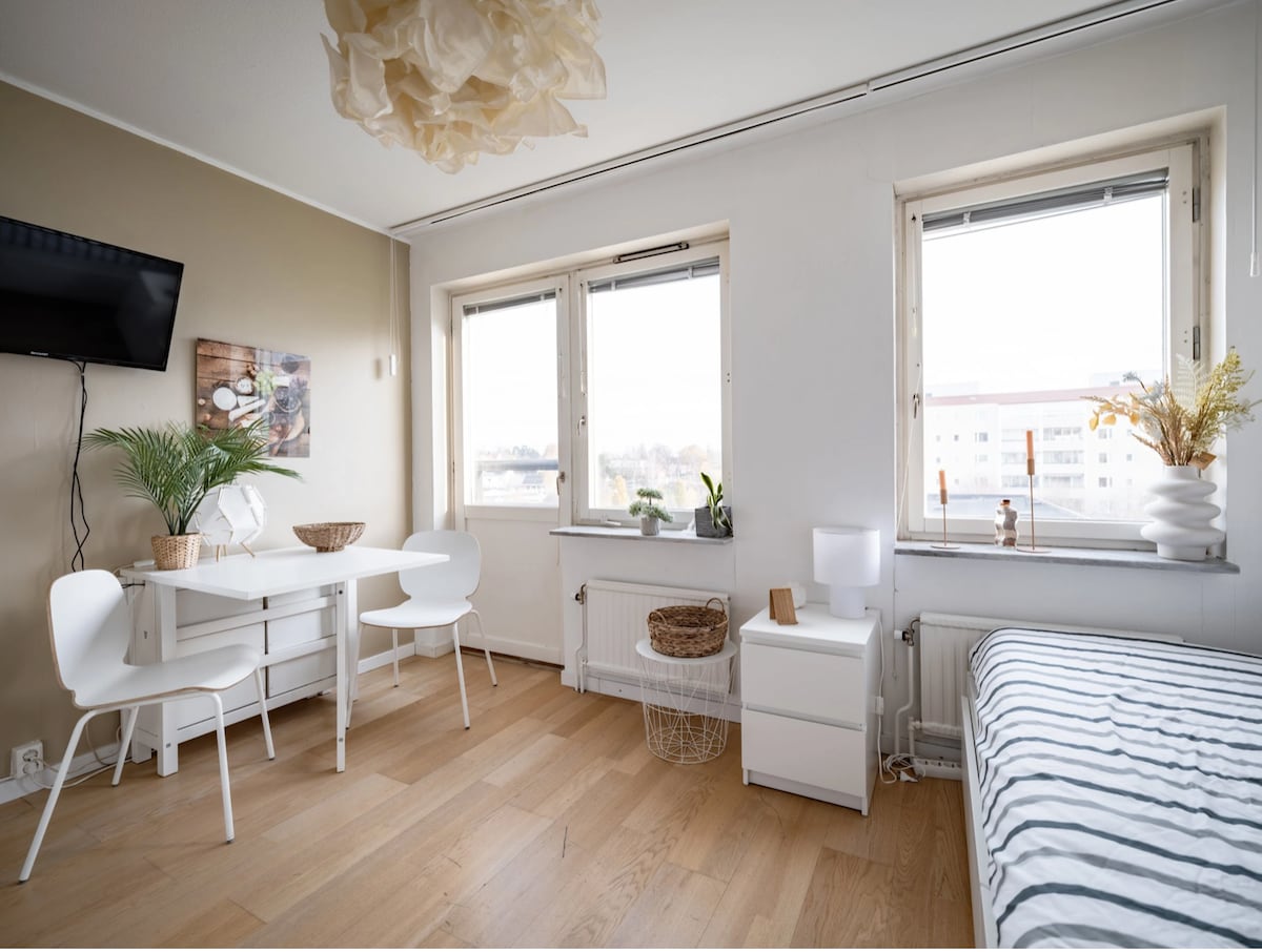 Modern fullt möblerad Studio i en helt ny byggnad på Kungsgatan i Linköping endast 300 meter till Resecentrum och Stora Torget. Lägenheten är mellan 25-31 kvm stort och har matplats, vardagsrumsdel och ett eget kök utrustat med spis, kyl/frys, mikro, diskmaskin och de husgeråd du behöver. Badrummet är helkaklade med dusch och tvättmöjligheter finns i huset. Lägenheten har en 160 cm bred säng. Gratis Wi-fi och TV med Chromcast.