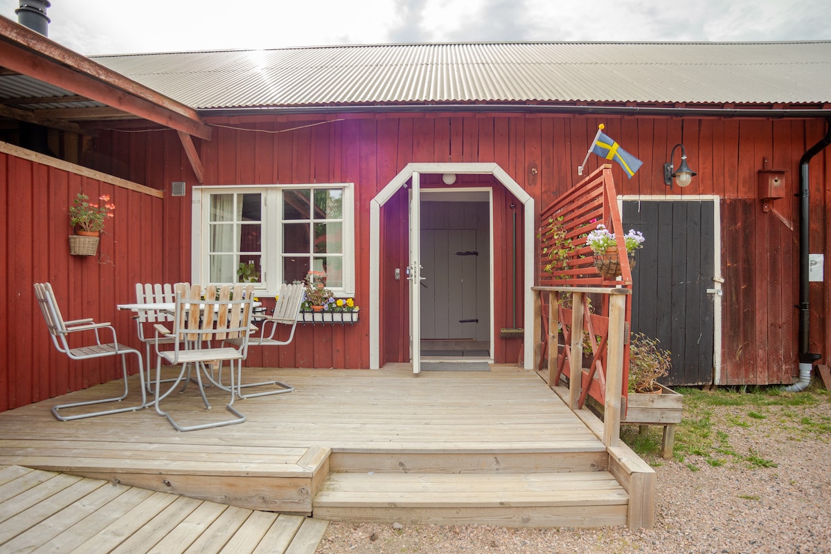 Välkommen till en liten lägenhet i gårdens lada med egen uteplats och naturen samt fåren in på knuten. Gården, som är från 1880-talet ligger ca 2 mil från Borås, och 7 km till närmsta samhälle med större ICA affär. Det är ca 5 km till fantastisk badplats och självklart finns det p-plats för bilen vid huset.