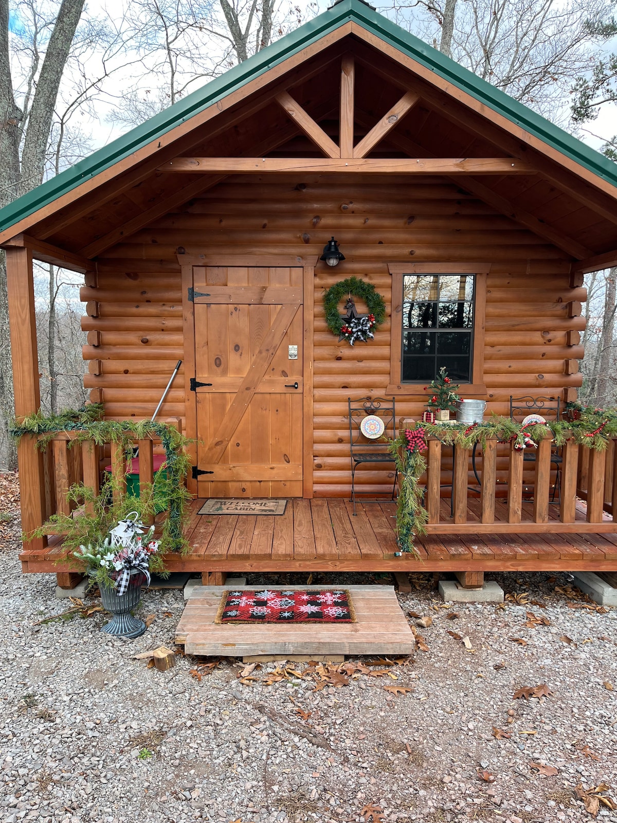 This modern log cabin is a large studio with all of the 'bells and whistles' !!! There is a very important looking king size bed, gorgeous mountain decor, fold out sofa, Adirondack chairs for the porch and old-fashioned porch swing. Full kitchen, one bath, 65" Smart TV with Fast WiFi. Tucked into the woods with a BIG hot tub, this is perfect place to celebrate or honeymoon. Come with friends. Or be selfish and bring her just to be together. Well, you could bring the pup too.