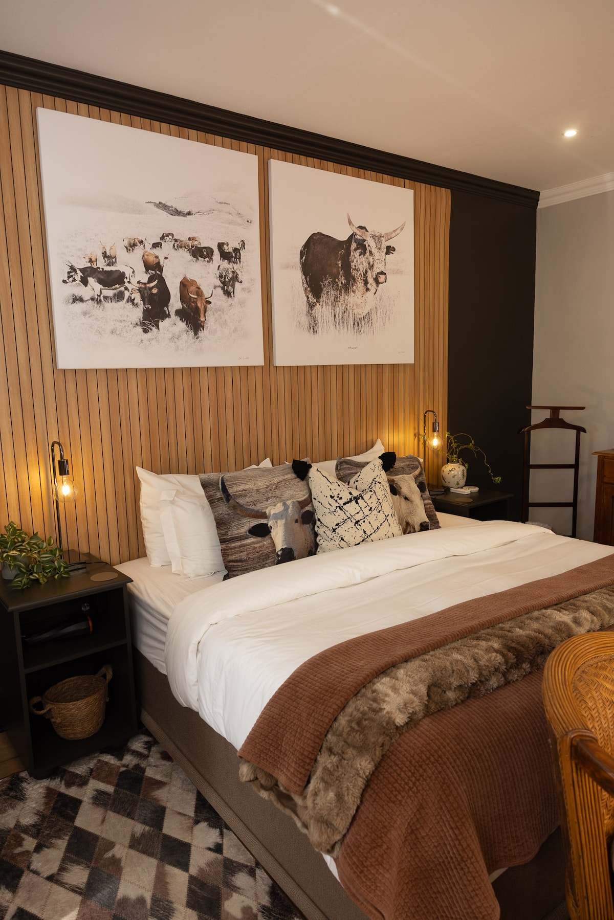 Queen size bed in a luxurious and spacious loft suite upstairs, with a fireplace, lounge area and a private balcony. En-suite with slipper bath and walk-in double shower with towels and gowns. Air-conditioning, DStv, Wi-Fi, electric blanket, safe.