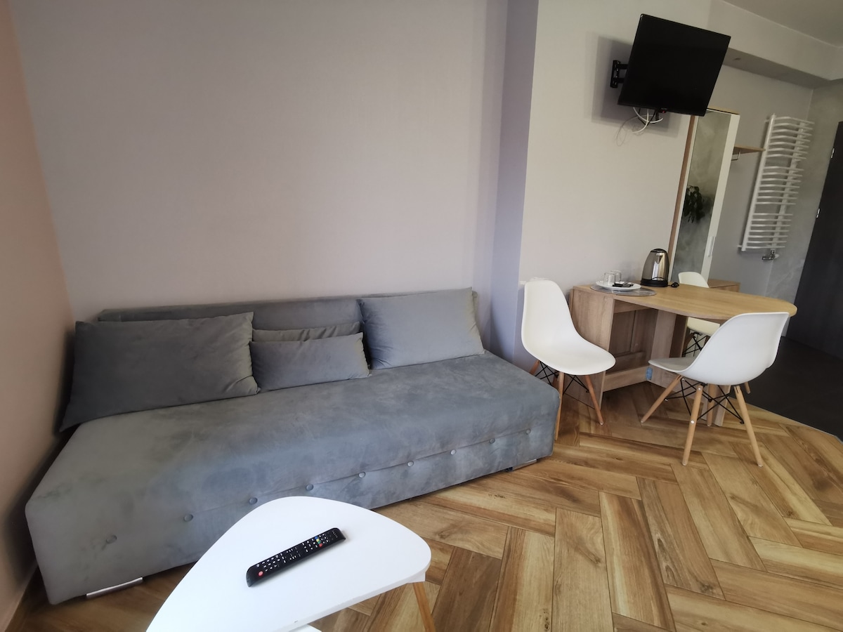 Apartament 3 – Studio z Aneksikiem (17,7 m²) Kompaktowe studio typu open-space z aneksem socjalnym – idealne na weekendowy pobyt lub dłuższy wyjazd we dwoje. Znajdziesz tu wszystko, czego potrzebujesz: wygodne łóżko, stolik, praktyczną łazienkę oraz miejsce na poranną kawę. Cicha lokalizacja tuż przy historycznym centrum gwarantuje zarówno spokój, jak i bliskość atrakcji.e blisko lokalnych atrakcji.