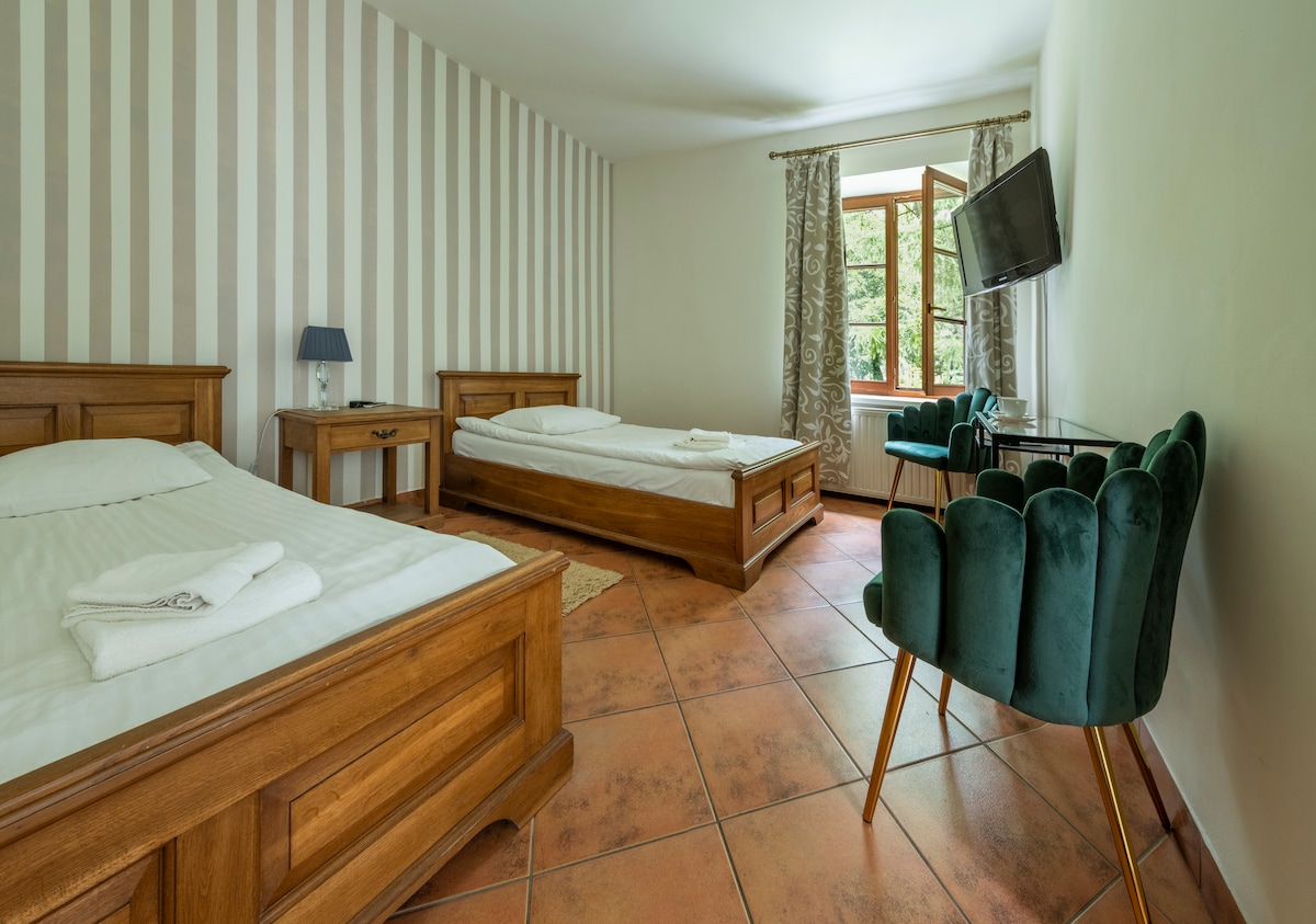 Pokój nr 4 w pawilonie zachodnim, dawnej oranżerii. Ten pięknie odrestaurowany budynek, teraz stanowi urokliwe miejsce dla naszych Gości. Dzięki bezpośredniemu dostępowi do dziedzińca, nasi Goście mogą cieszyć się spokojem i atmosferą tego wyjątkowego miejsca . Położona obok, w tym samym budynku, kawiarnia stwarza idealne miejsce na chwilę wytchnienia przy aromatycznej kawie oraz lokalnych przysmakach.