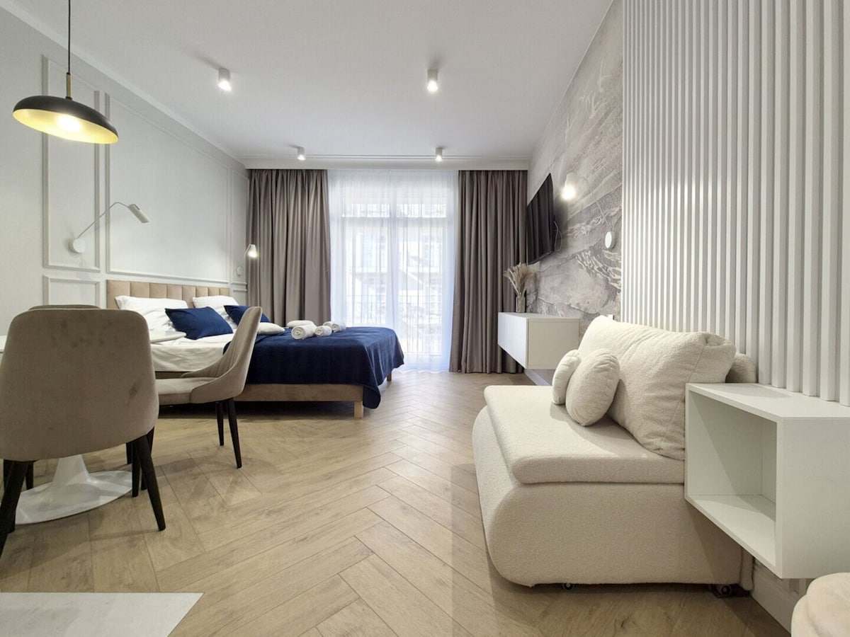 Zapraszamy do luksusowego apartamentu który łączy w sobie nowoczesność i klasyczną elegancję. Przestronny salon z aneksem kuchennym urządzony jest z dbałoscią o każdy detal. Jasne kolory i eleganckie meble tworzą wyjatkową atmosferę relaksu i komfortu. Znajdziesz tu wszystko czego potrzebujesz od płyty indukcyjnej przez piekarnik pralkę aż po zmywarkę. Przytulna sypialnia z łożem małżeńskim zapewni komfortowy sen. Gustownym uzupełnieniem apartamentu jest nowoczesna i funkcjonalna łazienka