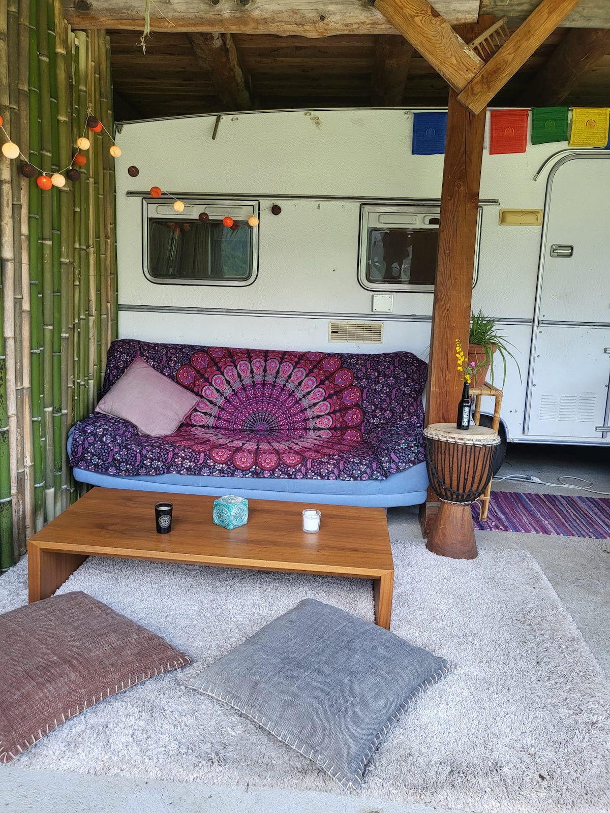 Der umgebaute Wohnwagen unter der Trauerweide zeigt das Beste vom Landleben. Das Tinyhaus fungiert als Rückzugsort im Garten. Rund um gibt es: einen Aussensitzplatz zum Verweilen, eine Küche unter dem Vordach und eine Badewanne hinter dem Häuschen. Mit einem Feuer unter der Badewannen kann man im warmen Wasser den Sternenhimmel geniessen. Im Haupthaus gibt es Waschmaschine, WC und Dusche. Durch die Nähe zu den Städten Bern und Neuenburg kann man gut Tagesausflüge machen.